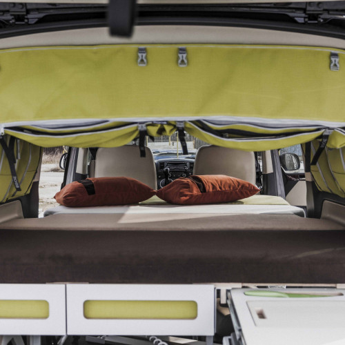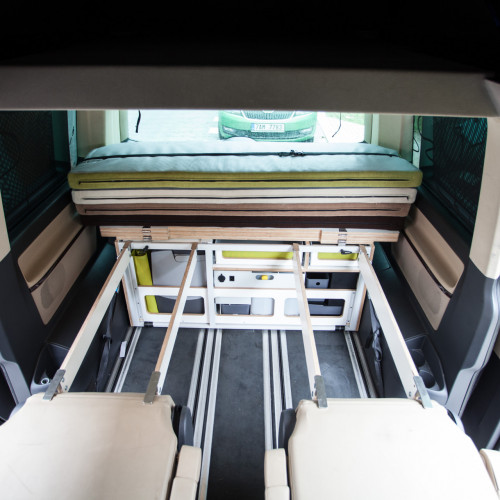 Matraci s roštem rozložíte jako leporelo během několika vteřin na podporu, která se buď opírá o sklopená sedadla nebo je samostatně stojící.