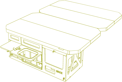 Konfigurátor vestavbyObsahuje výsuvný prostor pro vyjímatelné moduly vařiče a vody, dále prostor primárně určený pro lednici nebo chladící tašku. Další úložné prostory závisí na velikosti vozu.